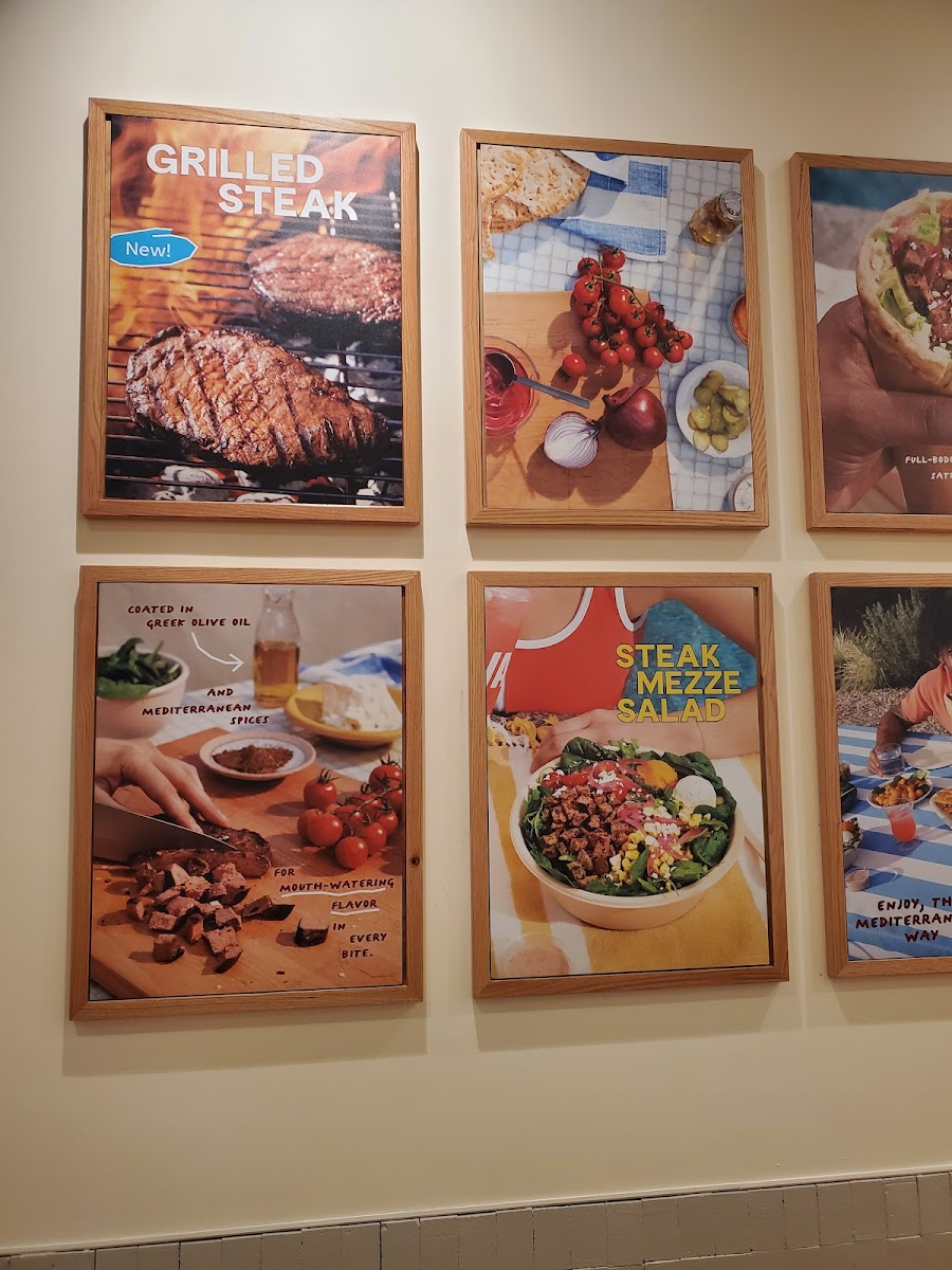 Steak, Crazy Feta®, red pepper hummus, feta, pickles, romaine, garlic dressing, Greek vinaigrette.